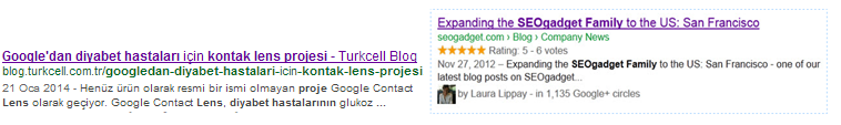 Google’dan diyabet hastaları için kontak lens projesi isimli makalenin html kodlarına Google ın önerdiği makale için gerekli olan taglari yerleştirdim ve sonuç olarak başarılı bir şekilde başlık, yazar ismi ve fotoğrafı, yayın tarihi, makale gövdesi (özet çıkarmak için), ve kullanıcı oylarını makale üzerinde işaretledi. Bundan sonra yaklaşık 1 hafta içinde ilgili blog makaleleri yaklaşık olarak aşağıdaki gibi gözükecektir.